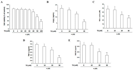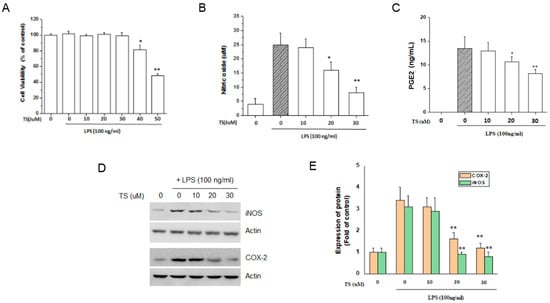 2.1. TS Inhibits the Production of NOs and PGE2 in LPS-Stimulated Macrophages