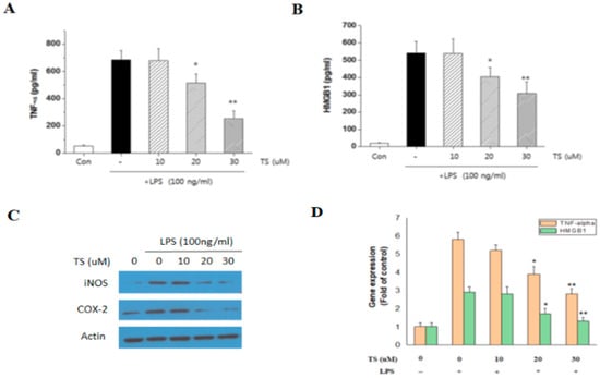 2.2. TS Inhibits TNF-α and HMGB1 Expression in LPS-Stimulated Macrophages