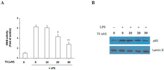 2.5. TS Inhibits the LPS-Mediated Activation of NF-κB in RAW 264.7 Cells