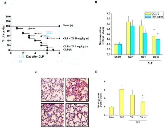 2.6. TS Improves Survival during Cecal Ligation and Puncture (CLP)-Induced Sepsis