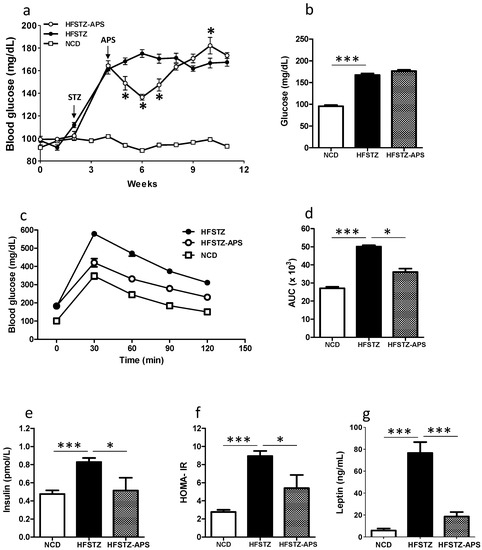APS ameliorated HFSTZ-impacted glycemic control. Three groups of APP/PS1 mice: normal chow diet (NCD) (n = 6), high fat diet plus streptozotocine (HFSTZ) (n = 7) or HFSTZ plus APS (HFSTZ-APS) (n = 6) are examined. (a) Fasting glucose levels detected every week; (b) Fasting glucose levels detected at 11 weeks after dietary manipulation; (c) Oral glucose tolerance testing was performed 10 weeks after dietary manipulation; (d) Area under curve (AUC) values of panel c; (e) Fasting insulin; (f) homeostasis model assessment of insulin resistance (HOMA-IR), and (g) leptin were determined at 11 weeks after dietary manipulation. Bars represent the mean ± SEM. * p < 0.01 and *** p < 0.001, significant difference from HFSTZ group.