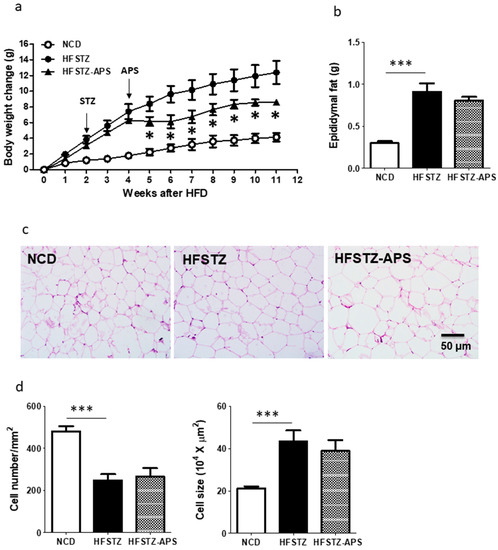 As shown in Figure 3a, HFSTZ-induced obesity was significantly reduced by the administration of APS. At the end of experiment, the epididymal fat weight was significantly increased and adipocyte size was significantly enlarged in HFSTZ mice as compared with NCD mice. However, APS was ineffective on reducing this adipocyte hypertrophy including epididymal fat mass, and adipocyte number and size (Figure 3b–d).