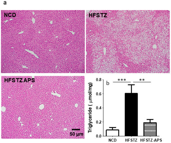 In hematoxylinand eosin (HE)-stained liver section, severe vacuolation of hepatocytes was observed in HFSTZ mice (Figure 4a). We found that APS significantly reduce this vacuolation of hepatocytes. Consistently, HFSTZ-increased liver triacyl glycerol (TG) content was mitigated by APS (Figure 4b).