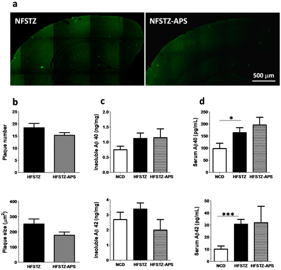 APS did not ameliorate HFSTZ-aggravated cerebral Aβ deposition and serum Aβ. APP/PS1 mice were treated with HFSTZ (n = 5) or HFSTZ-APS (n = 6); (a) Representative images of 1-bromo-2,5-bis-(3-hydroxycarbonyl-4-hydroxy) styrylbenzene (BSB)-positive plaques in the cerebral cortex of HFSTZ and HFSTZ-APS mice (scale bar, 500 μm); (b) Plaque size and plaque number in a single hemisphere were calculated using Metamorph analysis software. APP/PS1 mice were treated with NCD (n = 14), HFSTZ (n = 15) or HFSTZ-APS (n = 7); (c) Levels of soluble and insoluble form Aβ40 and Aβ42 in cerebral cortex were measured by enzyme-linked immunosorbent assay (ELISA); (d) The Serum Aβ40 and Aβ42 levels were measured using ELISA. Bars represent the mean ± SEM of four independent experiments. Data are shown as mean ± SEM. * p < 0.05, and *** p < 0.001, significant difference from HFSTZ group.