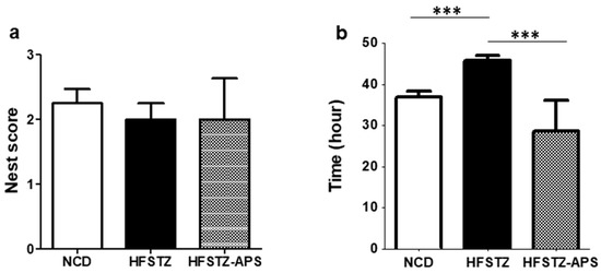 APS improved HFSTZ-prolonged nesting construction time. Nesting behavior for NCD (n = 7), HFSTZ (n = 6), and HFSTZ-APS (n = 3) mice groups were examined. (a) Nesting score (b) Nestcomplete-construction time. Data are shown as mean ± SEM. *** p < 0.001, significant difference from HFSTZ group.