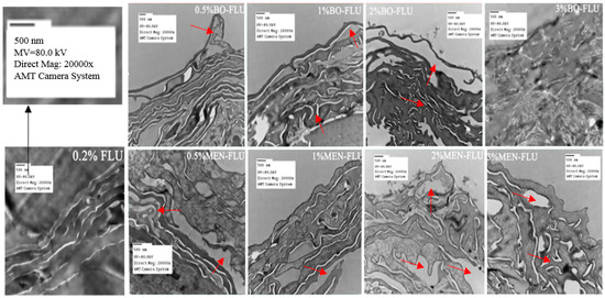 Transmission electron micrographs of the epidermis after 24 h of drug treatment (Magnification: 20,000 at 80 kV). From left to right, the concentration of PE was 0.0%, 0.5%, 1%, 2%, 3.0%. The picture labeled with “0.2% FLU” was the reference group not treated with penetration enhancer, 0.2% was the concentration of 5-FU, which was selected based on our pre-experiment, see Supplementary Materials. The picture labeled with “BO-FLU” was the group treated with borneol (top), and “MEN-FLU” for the group treated with menthol (below). The red arrows were used for the indication of disturbance on SC structure, and because of the obviously irreversible damage done by borneol at a penetration enhancers (PE) concentration of 3%, no arrows were used in the picture.