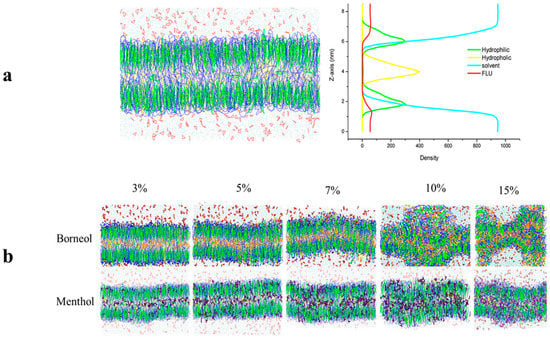 (a). The morphology of the initial bilayer together with its density distribution profile along the z-axis; (b). Stratum corneum (SC) bilayer morphology after exposure to different concentrations of borneol (top) and menthol (below).
