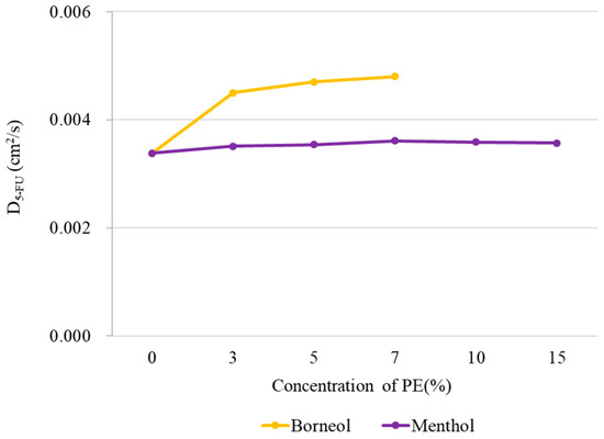 where is the average mean square displacement of 5-FU molecular along the axis of z at time t. In this work, we employed 3000 configurations across 300 ns simulation time to perform the calculation over all 5-FU molecule (Figure 4). For menthol, no distinct changes in diffusion coefficient were observed with increasing PE concentrations, indicating that menthol imparts minimal effects on 5-FU diffusion. However, for borneol, the diffusion coefficient of 5-FU immediately increased in the presence of borneol, implying that borneol improves the permeation of 5-FU into the bilayer. Although the diffusion coefficient increased with higher PE concentrations, the rate of increase was minimal, suggesting that some other mechanism may be responsible for the stronger penetration-enhancement effect of borneol at concentrations >10%.