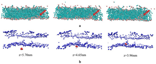 The observation of two process in CG MD, including transient pores formation process (a) and the diffusion process of 5-FU from the aqueous region into the hydrocarbon interior of stratum corneum lipids (b); (a) The aggregation of CER head groups in the bilayer center and formation of transient pores. The other components are set implicit, except for CER (pink dots for head groups and light green dots for tail groups), and the red arrow is used to indicate the position of the channel. (b) The diffusion of 5-FU from the aqueous region into the hydrocarbon interior of stratum corneum lipids aggregating around the CER molecule in the center of the bilayer, and the corresponding z-axis coordinates are shown underneath.