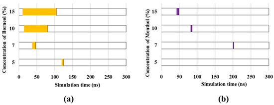 Molecular trajectory of borneol (a) and menthol (b) at different PE concentrations for 300 ns. Transient pore formation is depicted in purple and yellow, which, respectively, represents the time the transient pores were first observed and the time the transient pore disappeared.