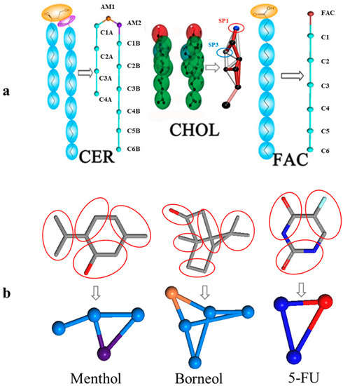 This assay mainly involved eight molecules, namely, 5-FU, borneol, menthol, CER, CHOL, FFA, PG, and water. The parameter files of the CG models of CER, CHOL, FFA, PG, and water are available in the Martini website, and the CG model of 5-FU, borneol, and menthol were developed according to the CG recipe published in the Martini website. The CG model of borneol and menthol were previously validated by our group [14,33]. For the CG model of 5-FU, the whole parameters and verification progress are presented in the Supplementary Materials.