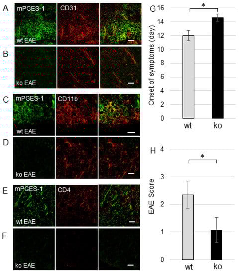 Expression of microsomal PGE2 synthase-1 (mPGES-1) and the effect of mPGES-1 on experimental autoimmune encephalomyelitis (EAE) paralysis. Immunohistochemistry image of mPGE-1 (green) with CD31 (A,B), CD11b (C,D), and CD4 (E,F) in the inflammatory region of spinal cords of wt EAE mice (A,C,E) and ko EAE (B,D,F) mice. Onset of symptoms (G) and the EAE score at day 19 (H) in EAE development. Scale bars (20 μm) for all images. wt, wild-type; ko, mPGES-1−/−. * p < 0.05.