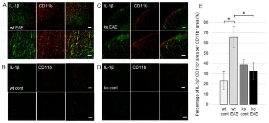 Second, we investigated IL-1β expression in CD4+ T cells in wt EAE and mPGES-1−/− EAE mice. There was no co-expression of IL-1β and CD4 in normal control wt mice or mPGES-1−/− mice (Figure 4B,D). In contrast, we found IL-1β expression in almost all CD4+ T cells in wt EAE (Figure 4A) mice, but in only a few CD4+ T cells in mPGES-1−/− EAE mice (Figure 4C). The percentage of the IL-1β+ CD4+ area per CD4+ area in the spinal cords of wt EAE mice was significantly higher than that in mPGES-1−/− EAE mice (Figure 4E). During in vitro Th17 differentiation, pro-IL-1β expression is strongly induced, suggesting that CD4+ T cells are a major cellular source of IL-1β during EAE pathogenesis [43]. Previous reports have shown that IL-1β is highly expressed in infiltrating macrophages [44], and IL-1β mRNA is induced in peritoneal leukocytes right after the initial EAE induction [45]. Moreover, activated macrophages are considered to be the predominant source of IL-1β in the brain [46]. We also observed IL-1β expression in CD11b+ macrophages in spinal cords (Figure 5). In wt EAE mice, IL-1β production in CD11+ macrophages and microglia was significantly increased compared with that of mPGES-1−/− EAE mice (Figure 5). However, we recently determined that the contribution of macrophages to the total production of IL-1β is minor in EAE pathogenesis [32,44]. The IL-1β released from macrophages and microglia might induce mPGES-1 in other macrophages and microglia and play roles in the inflammatory loop of the chronic phase of EAE [47]. In addition, the release of IL-1β from astrocytes might regulate the permeability of the blood–spinal barrier and the infiltration of immune cells into the spinal cord [48].