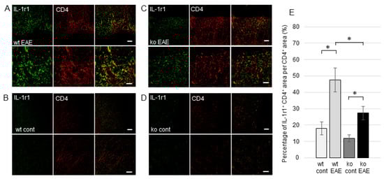 Expression of interleukin-1 receptor 1 (IL-1r1) in CD4+ T cells in the spinal cords of EAE and control mice. Immunohistochemistry image showing IL-1r1 (green) and CD4 (red) in the inflammatory region of the spinal cords of wt EAE (A), wt control (B), ko EAE (C), and ko control (D) mice. Percentage of the IL-1r1+ CD4+ area in the CD4+ area of EAE spinal cords (E). Scale bar (50 μm) for upper panels and (20 μm) for lower panels of (A–D). wt, wild-type; ko, mPGES-1−/−; cont, naïve mice; EAE, EAE mice. * p < 0.05.