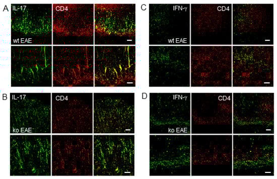 Expression of interleukin-17 (IL-17) and interferon-γ (IFN-γ) in CD4+ T cells in the spinal cords of EAE mice. Immunohistochemistry image showing IL-17 (green) and CD4 (red) in the inflammatory region of the spinal cords of wt EAE (A) and ko EAE (B) mice; and IFN-γ (green) and CD4 (red) in the inflammatory region of the spinal cords of wt EAE (C) and ko EAE (D) mice. Scale bar (50 μm) for upper panels and (20 μm) for lower panels of A–D. wt, wild-type; ko, mPGES-1−/−.