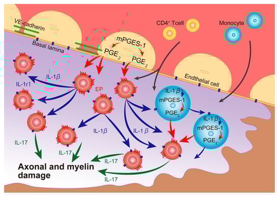 PGE2 synthesized by mPGES-1 facilitates the invasion of CD4+ T cells by inducing EP and IL-1r1 receptors, and potentiates IL-1β production, which exerts an autocrine signaling through IL-1r1 in wt EAE mice. This intercellular interaction affects IL-17 production, which finally aggravates inflammation and demyelination. Red arrows show production and secretion of PGE2, blue arrows show IL-1β, green arrows show IL-17, and gray arrows show cells infiltration from blood to spinal cord.