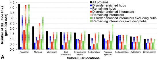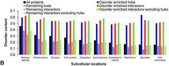 As expected, both hubs and the two sets of hub interactors that are engaged in the high-density and disorder enriched hub PPIs are characterized by a significantly higher amount of intrinsic disorder (p-value < 0.001; see “Structural properties” rows in Table 1). The corresponding relative enrichment is >130% when quantifying the disorder by both content and normalized number of the long IDPRs. These observations are further supported by the significantly lower number of disulfide links, which can be used as a proxy for the formation of a stable tertiary structure, among the hubs and hub interactors that are engaged in the disorder-enriched hub PPIs (p-value < 0.001, decrease by over 46%). We break down this analysis based on the subcellular location of these proteins. We annotate the locations based on the Universal Protein resource (UniProt) tags using a protocol defined in [64]. We analyze the results for all considered human proteins, hubs, hub interactors, and hub interactors that exclude hubs; the latter three proteins sets are subdivided into proteins associated with the disorder-enriched hub PPIs versus the remaining proteins. To ensure statistically sound estimates of the disorder content and number of disulfide bonds, our analysis includes 10 cellular locations for which we found at least 10 proteins for all considered protein sets, see Figure 2. As expected, we observe that the counts of the disulfide bonds vary between the subcellular locations, with substantially larger numbers for secreted proteins when compared to the other cellular compartments (black bars in Figure 2A). This is in agreement with prior research, which similarly showed enrichment in the eukaryotic proteins associated with secretory pathways and lower abundance in the other locations, in particular in the cytoplasm [65]. More importantly, the disorder-enriched protein sets are characterized by the higher numbers of the disulfides (blue, red, and green bars with horizontal stripes in Figure 2A) compared to the corresponding sets of the proteins that exclude the disorder-enriched proteins (solid blue, red, and green bark in Figure 2A). Figure 2B confirms the expected trend that proteins involved in the disorder-enriched PPIs are characterized by the increased levels of disorder (solid bars are higher than the corresponding striped bars). It also show that the levels of the disorder content vary between subcellular compartment, with the highest values being found in the nucleus and lowest levels being among the membrane and secreted proteins. This is in agreement with the results shown in several recent studies [25,50,66].