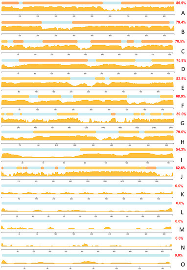 Intrinsic disorder levels in the disordered human hubs characterized by the highest levels of disorder (A–E), highly disordered hubs characterized by the highest levels of interactability (F–J), and ordered hubs with the highest interactability levels (K–O). The disorder was annotated using the MobiDB platform [141,142,143]; disorder content is shown in red font. Each plot represents disorder tendencies in two forms—by bar plots showing location of IDPRs and by area plots showing sequence distribution of consensus disorder scores evaluated by MobiDB lite disorder predictor [143]. (A) Thyroid hormone receptor-associated protein 3 (UniProt ID: Q9Y2W1). (B) Zinc finger CCCH domain-containing protein 18 (UniProt ID: Q86VM9). (C) Scaffold attachment factor B1 (UniProt ID: Q15424). (D) Intracellular hyaluronan-binding protein 4 (UniProt ID: Q5JVS0). (E) TATA-binding protein-associated factor 2N (UniProt ID: Q92804). (F) BAG family molecular chaperone regulator 3 (UniProt ID: O95817). (G) CREB-binding protein (UniProt ID: Q92793). (H) RNA-binding protein EWS (UniProt ID: Q01844). (I) Cyclin-dependent kinase inhibitor 1 (UniProt ID: P38936). (J) Mediator of DNA damage checkpoint protein 1 (UniProt ID: Q14676). (K) Ubiquitin (UniProt ID: P0CG48; 8548 interactors). (L) Growth factor receptor-bound protein 2 (UniProt ID: P62993; 804 interactors). (M) Actin (UniProt ID: P60709; 263 interactors). (N) Protection of telomeres protein 1 (UniProt ID: Q9NUX5; 200 interactors). (O) Protein mago nashi homolog (UniProt ID: P61326; 190 interactors).