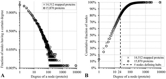 We collected a set of currently available PPIs for human proteins and used this information to annotate hub proteins and their partners/interactors. The raw data on the PPI were obtained from the mentha resource [63]. This resource integrates expert curated PPIs obtained from a comprehensive set of five primary databases: MINT [250], IntAct [251,252], DIP [253], MatrixDB [254], and BioGRID [255]. We extracted all records from taxon 9606 (Homo sapiens) for this analysis. These records include 154,395 interactions that cover 15,870 proteins. Next, we mapped these proteins into UniProt [256] to secure their reference sequences and relevant annotations. We were able to map 14,512 proteins that cover 151,461 interactions into the UniProt. The most relevant to our study characteristics of the PPI networks is the degree of the proteins (nodes in the network), which is defined as the number of partners of a given protein. Figure 6 compares the distribution of the degrees between the original set of 15,870 proteins and the set of 14,512 mapped proteins. Figure 6A reveals that the fractions of proteins with a given degree are very similar between the two datasets of proteins. The same observation is true in Figure 6B that compares the two sets of cumulative fractions of proteins with a given degree. This means that the loss of 8.5% of proteins due to mapping into the UniProt, which was necessary to collect the functional and structural annotations for these proteins, did not bias the main characteristics of the underlying network.