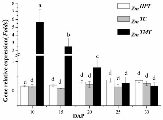 During the maturation of sweet corn, the storage products of the kernel are synthesized, beginning at around 15 DAP. The synthesis continues until the metabolic activity is prevented by desiccation at seed maturity (after 40 DAP) []. The expression levels of these three genes increased or decreased at the initial stage of sweet corn maturation (10–25 DAP), due to its vigorous growth period. This is followed by a gentle change during the late stage (25–30 DAP), because of a decline of metabolism, which was in coincidence with the maize kernel development rule. In this study, the expression levels of ZmHPT and ZmTC increased by 2.25 folds and 1.5 folds, respectively, whereas the level of ZmTMT decreased 33 folds at 10–30 DAP during the sweet corn kernel development. High expression of ZmTMT may result in the accumulation of the conversion of γ- to α-forms in the early developmental stage.