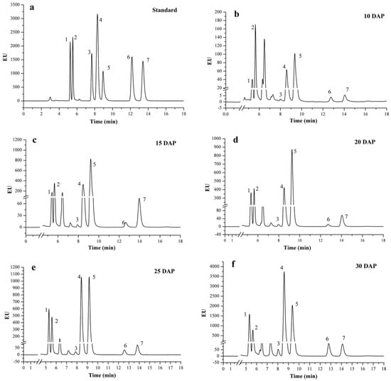 NP-HPLC chromatogram of vitamin E standard and extracts in sweet corn during kernel development (numbers 1–7 represent α-T, α-T3, β-T, γ-T, γ-T3, δ-T, δ-T3, respectively, T means tocopherol, and T3 means tocotrienol). (a) is the chromatograms of vitamin E standards; (b–f) are the chromatograms of sweet corn extracts from 10 DAP to 30 DAP. EU = Emission Unit.
