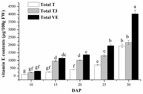 According to Table 1, we found that α-T was the predominant component amongst total tocopherols with a ratio of 61%. And γ-T accounted for 28% amongst total tocopherols. Both the constitution of α-T and γ-T were the highest at 20 DAP. Interestingly, there was a study which showed that within 41 corn genotypes, the average total tocopherols contents were 54.1 μg/g dry weight at 21 DAP. γ-T accounted for 73% of total T, and α- and δ-T accounted for 24% and 3% of total T, respectively []. Most research mainly focuses on the tocopherols of sweet corn [,]; tocotrienols have received little attention, because they were widely known to be more predominant in corn oil (80 μg/g fresh weight) []. However, in our study, tocotrienols were shown to have a large proportion in sweet corn kernels, and accounted for 67.3% amongst total VE. The contents of tocotrienols ranked as γ-T3, α-T3, and δ-T3 (from highest to lowest).