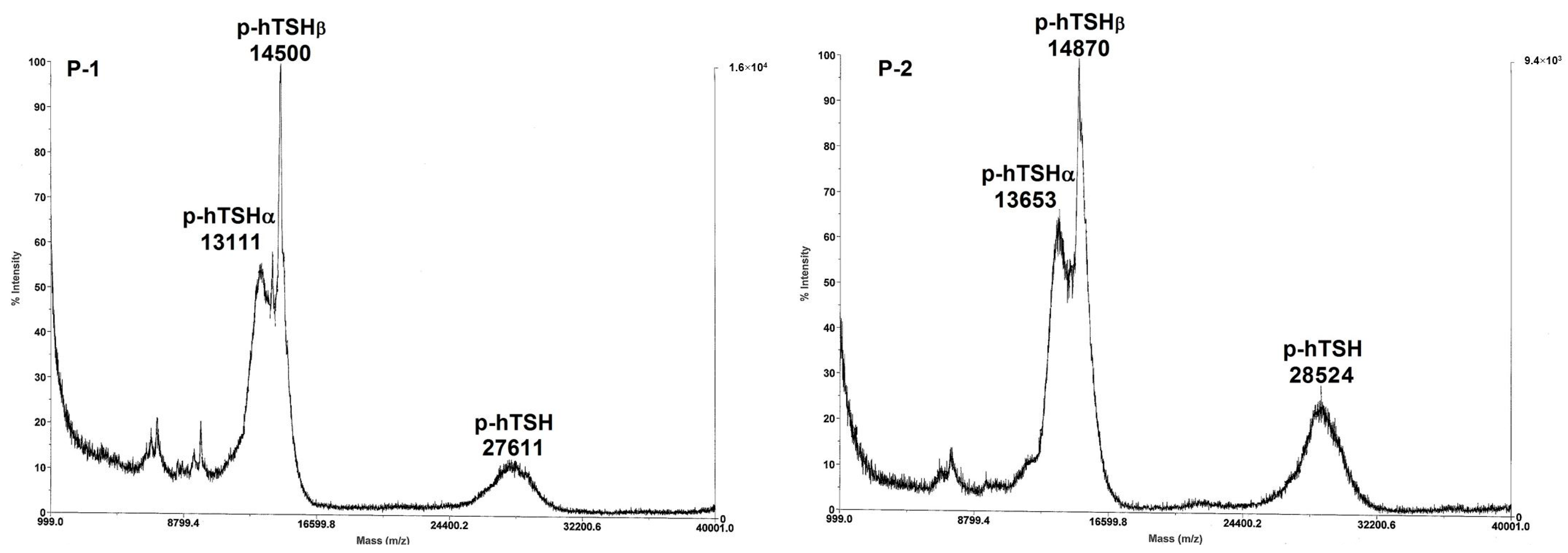 MALDI-TOF-MS molecular mass determination of heterodimeric hTSH was carried out by American International Biotechnology (AIBio Tech. Services, Richmond, VA, USA) using sinapinic acid as the matrix and a Voyager-DE BioSpectrometry Workstation from Applied Biosystems (Foster City, CA, USA).The molecular mass of the heterodimer could be further confirmed by summing the α- and β-subunit mass values, simultaneously detected in the spectrogram, as found in Laidler et al. [42] and in previous work from our group [8,36,43].