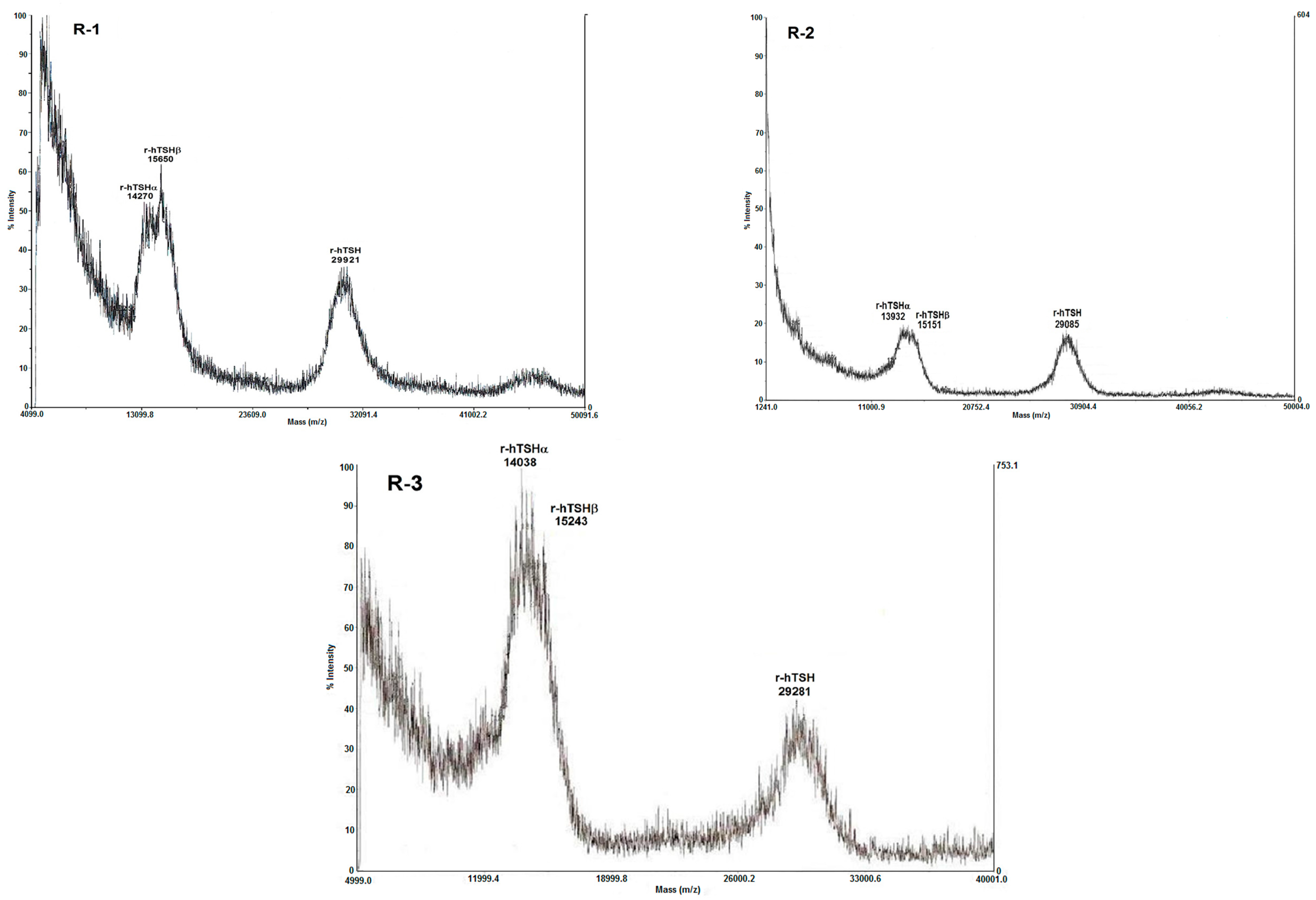 MALDI-TOF mass spectra of native, pituitary (P1, P2) and of recombinant (R1, R2, R3) hTSH preparations.