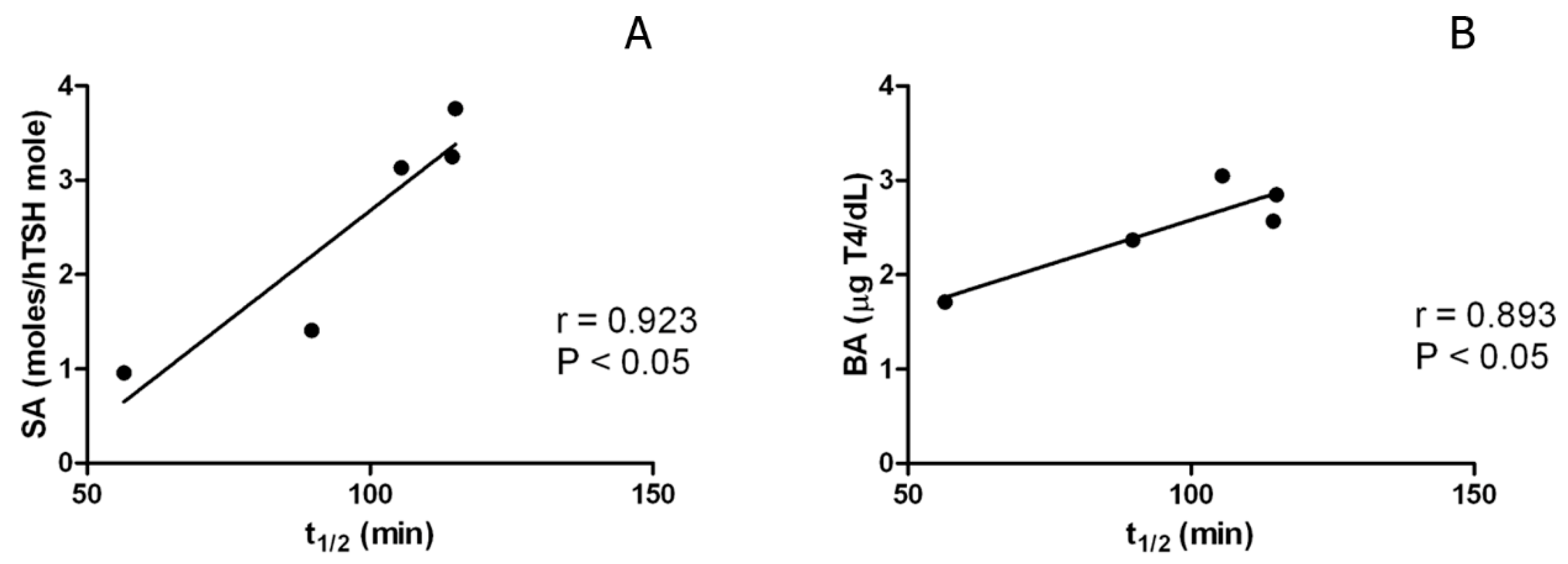 Correlation curves comparing: (A) t1/2 with sialylation (SA), Y = 0.047X − 1.98; r = 0.923; p < 0.05; and (B) t1/2 with bioactivity (BA), Y = 0.019X + 0.69; r = 0.893; p < 0.05, considering all five hTSH preparations.
