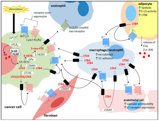 Given that both cancer cells and non-cancer stromal cells are potent producers of eicosanoids, tumour progression will likely involve an integrated response to eicosanoid signalling pathways. Apart from malignant cells, the TME consists of cells of the immune system, the tumour vasculature and lymphatics, and the extracellular matrix (for a concise description and summary of these cell types, please refer to [35]). This review will focus on the role of 5-LO and its metabolites not only in cancer cells but also cellular components of the TME including macrophages/monocytes, neutrophils, mast cells, B- and T-lymphocytes, and connective tissue cells such as endothelial cells, adipocytes and fibroblasts. Examples from the literature will be provided where 5-LO signalling is involved in the cross-talk between these different cell types. The potential to therapeutically exploit cellular components of the TME through the targeting of this enzymatic pathway will also be discussed. We propose that manipulating LO-dependent AA metabolism in the TME could offer new strategies to block cancer-related inflammation and immune escape.