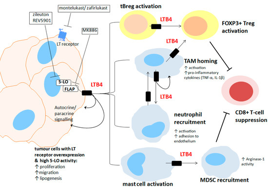 Pro-tumorigenic interactions between cancer cells and immune cells in the tumour microenvironment are mediated by the 5-lipoxygenase signalling pathway: Cancer cell produced LTB4 can stimulate increased proliferation, migration and lipogenesis (i.e., free fatty acid release) in an autocrine fashion and can also stimulate these processes in other tumour cells in the tumour mass. Cancer cell LTB4 paracrine signalling can induce and activate a number of immune cell types in the TME including tumour-associated macrophages (TAMs), neutrophils and mast cells. This results in increased production of pro-inflammatory signalling molecules (e.g., TNF-α, and IL-1β), increased vasculature adhesion and homing to the TME with further activation of other leukocytes. Cancer-associated stimulation of regulatory B-cell (tBreg) LTB4 production leads to activation of regulatory FOXP3+ Tregs which suppress anti-tumorigenic cytotoxic CD8+ T-cells. Mast cell activation through 5-LO signalling results in an increase in their LTB4 activity which can stimulate myeloid derived suppressor cell (MDSC) recruitment and an increase in MDSC arginase-1 activity that can subsequently suppress cytotoxic CD8+ T-cell activity.