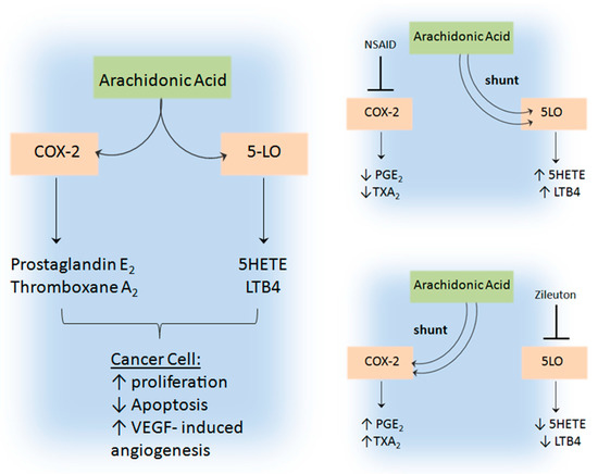 As previously discussed, 5-LO is increased in colon cancer specimens and colonic dysplastic lesions/polyps [86]. 5-LO has strong converging roles with another major eicosanoid involved in cancer, cyclooxygenase-2 (COX-2), which has been strongly linked to tumorigenesis and angiogenesis [161]. Given that both enzymes utilise the same substrate of AA and have converging targets of VEGF expression and release, redundancy of these pathways has been suggested [161]. Recent pharmacological inhibition studies have indicated a shunting mechanism between these two arms of the AA pathway where blocking of one enzymatic pathway leads an upregulation of the other [141,162,163] (Figure 4). Ye et al. showed that cigarette smoke can induce adenoma formation in the colon of mice and that inhibition with the 5-LO inhibitor zileuton not only reduced 5-LO expression but also downregulated VEGF, MMP2 and MMP9 [141]. In a subsequent study by this group COX-2 inhibition was shown to result in an upregulation of 5-LO LTB4 [163]. This shunting process was not observed when 5-LO was inhibited, suggesting 5-LO inhibitors are more effective in this mouse xenograft model of cigarette smoked-induced colon cancer. Park et al. demonstrated that inhibition of COX-2 activity in vitro led to an increased LTB4 in head and neck squamous cell carcinoma (HNSCC). Knock-down of COX-2 showed only modest effects to cell proliferation in several cell lines but combined knock-down of both COX-2 and 5-LO had superior inhibitory effects on tumour cell proliferation and VEGF production [162].