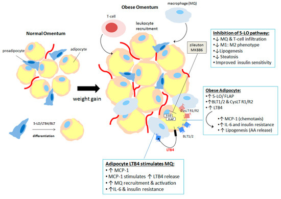 Increased 5-lipoxygenase activity in adipose tissue is associated with obesity: 5-LO signalling has been shown to be involved in preadipocyte differentiation to mature an adipocyte. Adipocytes derived from obese adipose tissue have increased 5-LO/FLAP expression and increased leukotriene receptor expression. Upregulated LTB4 production leads to increased MCP-1 production and increased macrophage (MQ) and T-cell recruitment to the fat. Increased LTB4 signalling also leads to upregulated lipogenesis and thus increased arachidonic acid (AA) availability for further leukotriene synthesis by adipocytes and adipose tissue associated MQs (ATM). LTB4 stimulates MQ production of MCP-1, further LTB4 production, increased pro-inflammatory cytokines such as IL-6 and increased macrophage homing to the fat. Pharmacological blocking of 5-LO signalling in adipose tissue decreases lipogenesis, leukocyte infiltration, decreases M1 type MQs and increases M2 type MQs, overall leading to improved insulin sensitivity and liver function.