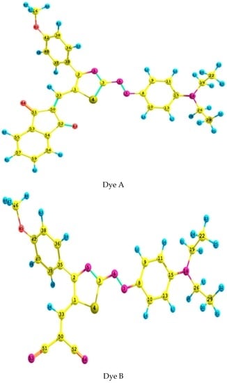 As Table 3 shows, the order of the electronic chemical potential for the three dyes is as follows: B ˃ C ˃ A. The global electrophilicity index (ω) estimates the stabilizing energy when a surrounding environment supplies a chemical entity with an additional electronic charge. The index (ω) relates to the electronic chemical potential (µ) and the chemical hardness (η) through Equation (3) []: