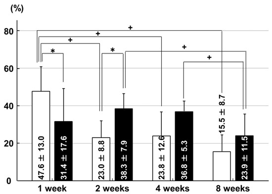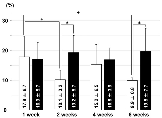 Chondrocyte apoptosis rates in the articular cartilage of the medial tibial condyle. □: sham group; ■: immobilization group. * p < 0.05; + p < 0.05; n = 6.