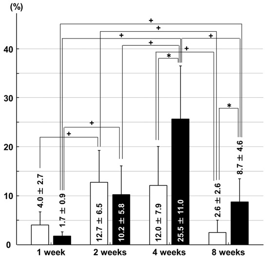 Chondrocyte apoptosis rates in the anterior cruciate ligament (ACL) insertion. □: sham group; ■: immobilization group. * p < 0.05; + p < 0.05; n = 6.