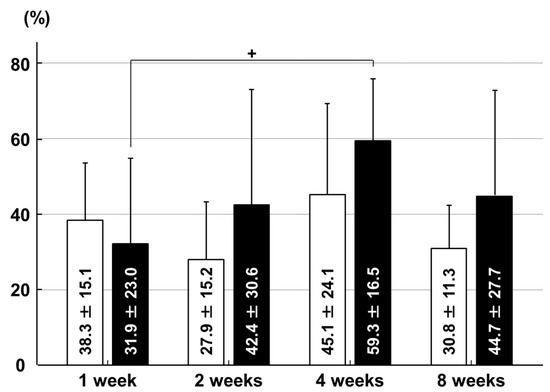 Chondrocyte proliferation rates in the articular cartilage of the medial tibial condyle. □: sham group; ■: immobilization group. + p < 0.05; n = 6.