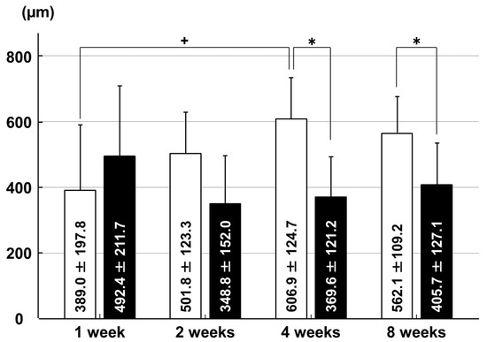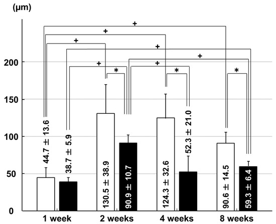 Thicknesses of Glycosaminoglycan (GAG)-stained areas in the ACL insertion. □: sham group; ■: immobilization group. * p < 0.05; + p < 0.05; n = 6.