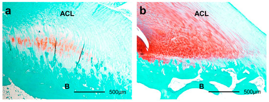 Histological sections of ACL insertions eight weeks after surgery by safranin O staining (40×). The smaller GAG-stained red area in immobilization group (a) than that in the sham group (b) was shown. ACL: anterior cruciate ligament. B: bone.