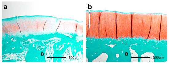 Histological sections of articular cartilage eight weeks after surgery by safranin O staining (40×). The smaller GAG-stained red area in the immobilization group (a) than that in the sham group (b) was shown. B: bone.