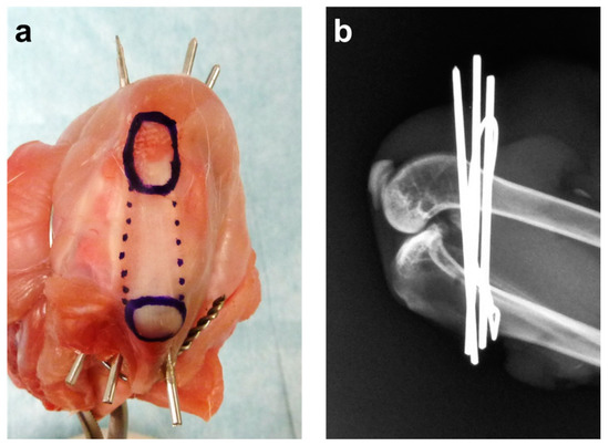 Forty-eight skeletally immature male Japanese white rabbits (weight range: 2.5–3.0 kg) were used for this study. The rabbits were maintained in accordance with the guidelines of the Ethical Committee of the University of Tsukuba and the National Institutes of Health guidelines for the care and use of laboratory animals (NIH Pub. No. 86-23 Rev. 1985). The rabbits were randomly divided into an immobilization (n = 24) and a sham (n = 24) group. After intravenous barbiturate injection (40 mg/kg), an anterior skin incision was made over the right knee. The knee was completely immobilized in deep flexion with three stainless steel wires (1.6 mm diameter) installed between the distal femur and proximal tibia, and a soft stainless steel wire (0.8 mm diameter) coiled between the distal femur and proximal tibia with its ends firmly anchored. Complete immobilization in deep knee flexion was confirmed, preventing knee motion throughout the experimental period. This surgical method was simulated using a cadaver rabbit before the start of this study (Figure 9a), and we radiographically confirmed that the wires were not within the knee joint capsule (Figure 9b). In the sham group, we performed the same surgical procedure on animals, except the wires were removed immediately after installation. The incision was closed with a 2–0 non-absorbable suture. After surgery, the animals were allowed to move freely in their cages and did not receive antibiotics. Six animals in each group were sacrificed at 1, 2, 4 and 8 weeks after surgery.