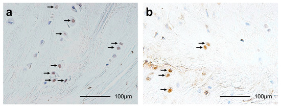 ACL-tibia complexes from each animal’s were fixed in 10% neutral-buffered formalin for 1 week. After fixation, all specimens were decalcified using 10% ethylenediaminetetraacetic acid (pH 7.4) and embedded in paraffin. The specimens were sliced to 5 mm thick in the center of the ACL insertion site and the center of the medial tibial condyle. These were stained with hematoxylin and eosin (HE) to assess histomorphology and with safranin O to assess GAG content [5,6,7,8,9]. In the ACL insertion and tibial articular cartilage, we performed terminal deoxynucleotidyl transferase-mediated deoxyuridine triphosphate-biotin nick-end labeling (TUNEL) for detecting apoptotic cells [5,6,7,8,9] (Figure 10a), and proliferating cell nuclear antigen (PCNA) for detecting proliferating cells [6,9] (Figure 10b).