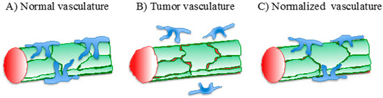 Aberrant tumor vessels and vascular normalization. (A) In normal vessels, endothelial cells (ECs) (green) are tightly adherent to each other, forming a continuous barrier. This, together with pericytes (blue), stabilizes the vessel wall; (B) In tumor vessels, ECs have an irregular morphology and are loosely attached to each other, resulting in intercellular gaps and, therefore, increased permeability; (C) Antiangiogenic treatments promote vascular normalization by restoring pericyte coverage and inter-endothelial adhesion, which revert vessel structure and function to a “normal-like” state. The red area indicates the vessel lumen.