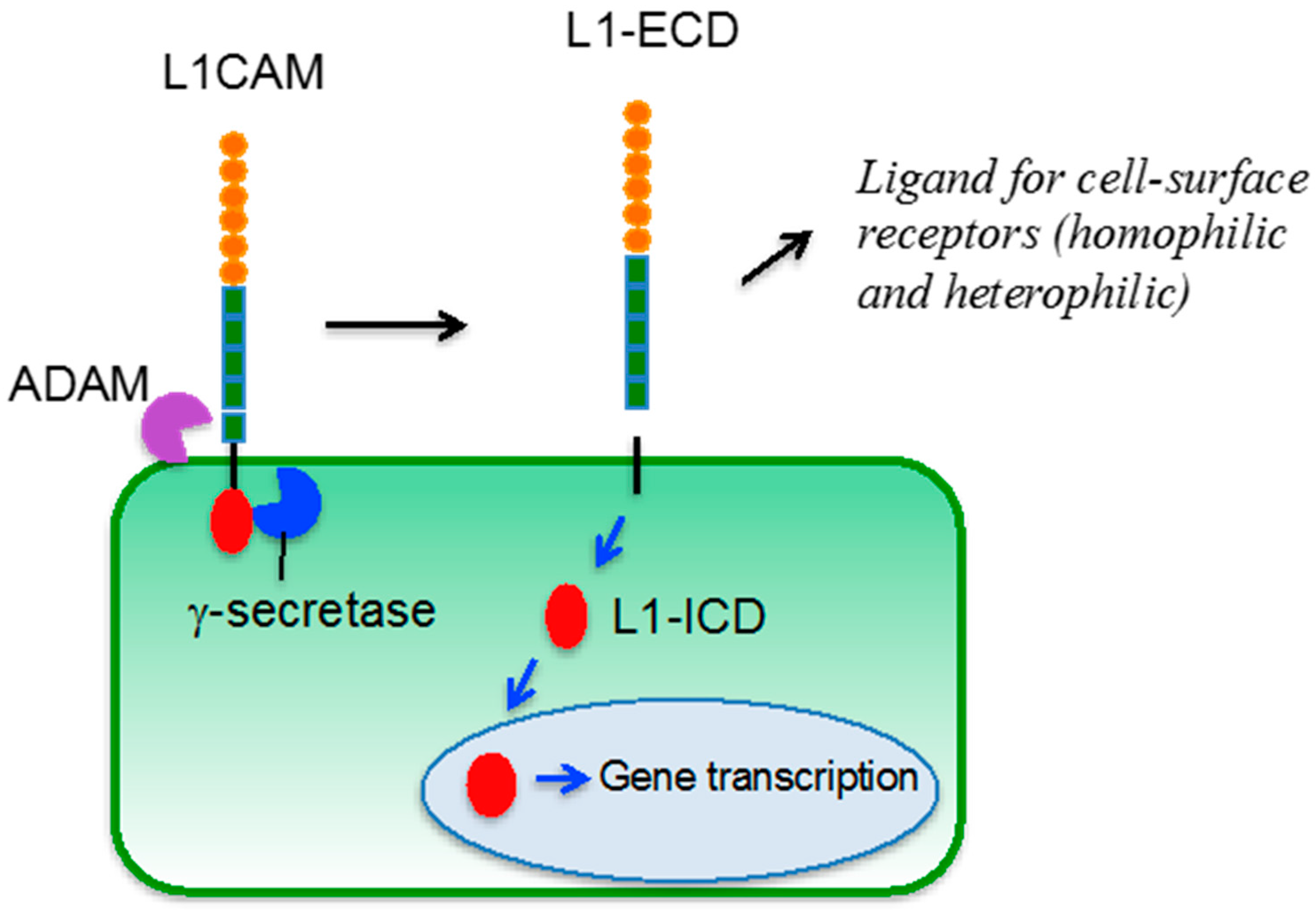 L1CAM can undergo membrane-proximal proteolytic cleavage mediated by members of the a disintegrin and metalloproteinases (ADAM) family, which induce shedding of the ectodomain that still retains biological activity [46]. The membrane bound C-terminal fragment is further processed by presenilin/γ-secretase activity [47], resulting in the release of an intracellular domain that is capable of translocating to the nucleus and regulating the expression of certain genes [48] (Figure 3).