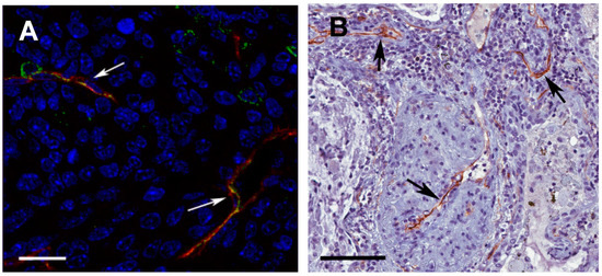 Expression of L1CAM in tumor vessels. (A) Mouse orthotopic, syngeneic model of pancreatic carcinoma (Panc02 cells transplanted into the head of the pancreas) co-stained for the vascular marker CD31 (red) and L1CAM (green). Scale bar, 15 μm; (B) Human lung carcinoma stained for L1CAM (brown). Arrows indicate L1CAM-positive tumor vessels. Scale bar, 150 μm. F.A. and U.C., unpublished data.