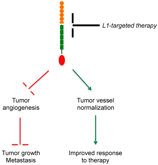 Finally, the genetic manipulation of endothelial L1CAM in the context of a mouse tumor model revealed that L1CAM in tumor vessels prevents their morphological and functional maturation. Indeed, ablating L1CAM from the tumor vasculature restored endothelial polarity, basement membrane deposition, and pericyte coverage. At the functional level, these structural changes were mirrored by a dramatic decrease in tumor vessel permeability [72]. Taken together, these findings point to L1CAM inactivation as a novel strategy to achieve vascular normalization in tumors.