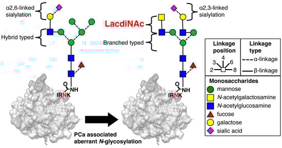 - Fukushima, K.; Satoh, T.; Baba, S.; Yamashita, K. α1,2-Fucosylated and β-N-acetylgalactosaminylated prostate-specific antigen as an efficient marker of prostatic cancer. Glycobiology 2010, 20, 452–460. [Google Scholar] [CrossRef] [PubMed]