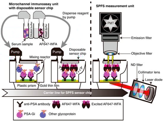 The schematic representation of serum PSA-Gi detection using a two-step surface plasmon field-enhanced fluorescence spectrometry (SPFS)-based WFA lectin-anti-PSA antibody immunoassay. Gray line arrows indicated that reagent dispense from reagent container to mixing reactor using pump. Gray dotted line arrows indicated mixing the content of mixing reactor by pump.