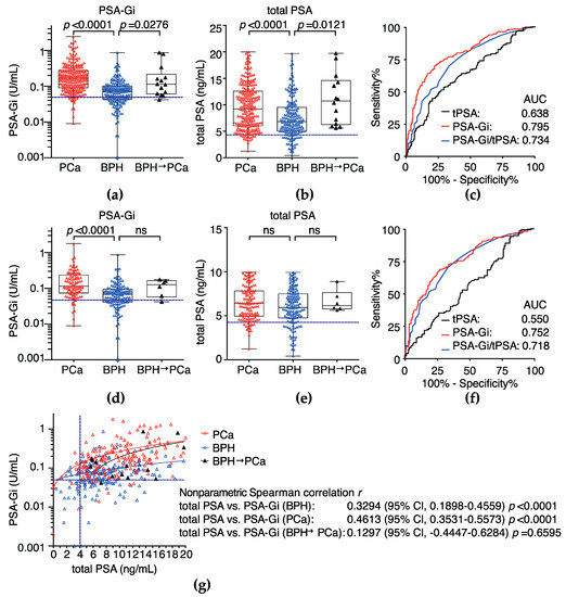 Serum levels of the PSA-Gi at Pbx in the patients who diagnosed as BPH or PCa by an SPFS-based lectin-antibody immunoassay. (a) PSA-Gi and (b) total PSA levels in patients with a diagnosis of BPH or PCa at a total PSA ≤ 20 ng/mL; (c) receiver-operator characteristic (ROC) curve analysis of total PSA, PSA-Gi, and PSA-Gi/total PSA in patients who had a diagnosis of BPH or PCa at a total PSA ≤ 20 ng/mL. The areas under the ROC curve (AUCs) for the prediction of PCa of PSA-Gi, total PSA, and PSA-Gi/total PSA were 0.795, 0.638, and 0.734, respectively; (d) PSA-Gi and (e) total PSA levels in patients with BPH or PCa at total PSA ≤ 10 ng/mL; (f) ROC curve analysis of total PSA, PSA-Gi, and PSA-Gi/total PSA in patients with BPH or PCa at a total PSA ≤ 10 ng/mL. The AUCs for the prediction of PCa by means of PSA-Gi, total PSA, and PSA-Gi/total PSA were 0.752, 0.550, and 0.718, respectively; (g) correlation between PSA-Gi and total PSA. Correlation coefficient was analyzed by non-parametric Spearman’s r-test. (a–g) The cutoff level at 90% sensitivity of PSA-Gi and/or total PSA is presented as a blue dotted line.