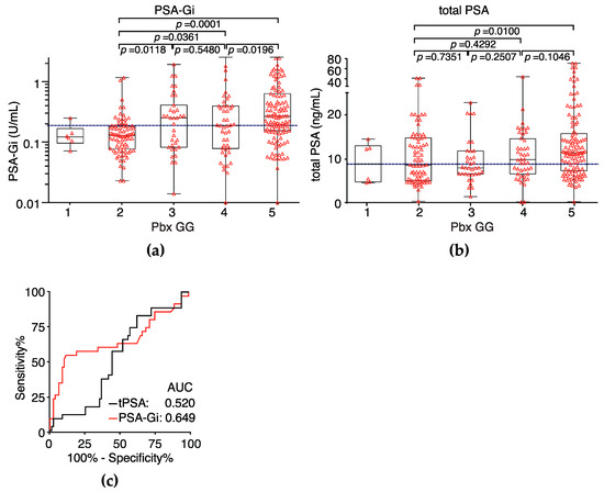 The serum PSA-Gi levels at Pbx in PCa patients who underwent radical prostatectomy (RP). (a) PSA-Gi levels before Pbx among PCa patients classified by the Pbx grade group (Pbx GG); (b) total PSA level before Pbx of PCa patients classified by the Pbx GG. Cutoff levels at 57.1% sensitivity of PSA-Gi and/or total PSA is presented as a blue dotted line; (c) ROC curve analysis of total PSA and PSA-Gi in PCa patients with Pbx GG 2 and Pbx GG 3. The AUCs for the prediction of patients with Pbx GG 3 of PSA-Gi and total PSA were 0.649 and 0.520, respectively.